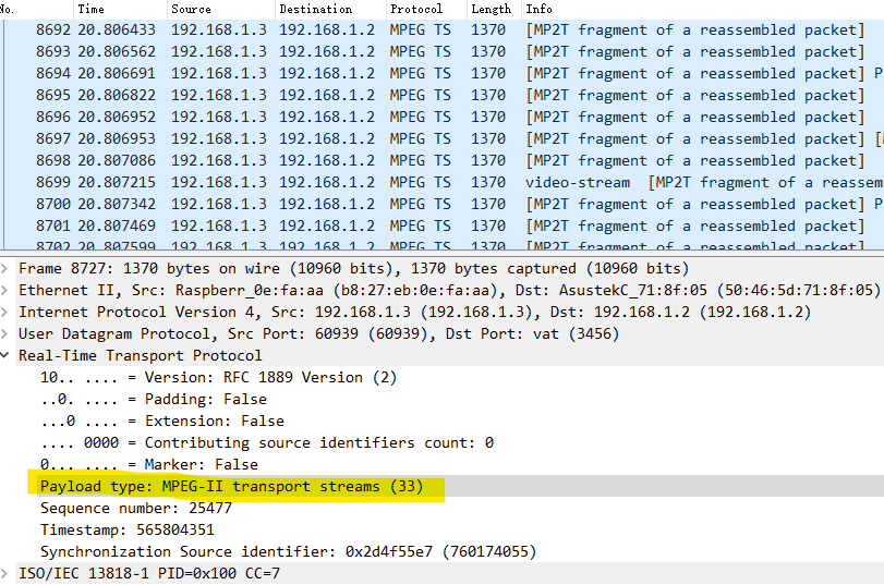 可以看到有一些类型是固定的。正如上图显示的负载类型为33,就表示这个RTP包的内容为封装为TS的音视频数据,客户端就可以按照mpeg ts解码了。如果使用的是96以上的负载类型,就需要写一个sdp文件告诉客户端怎么解码了。