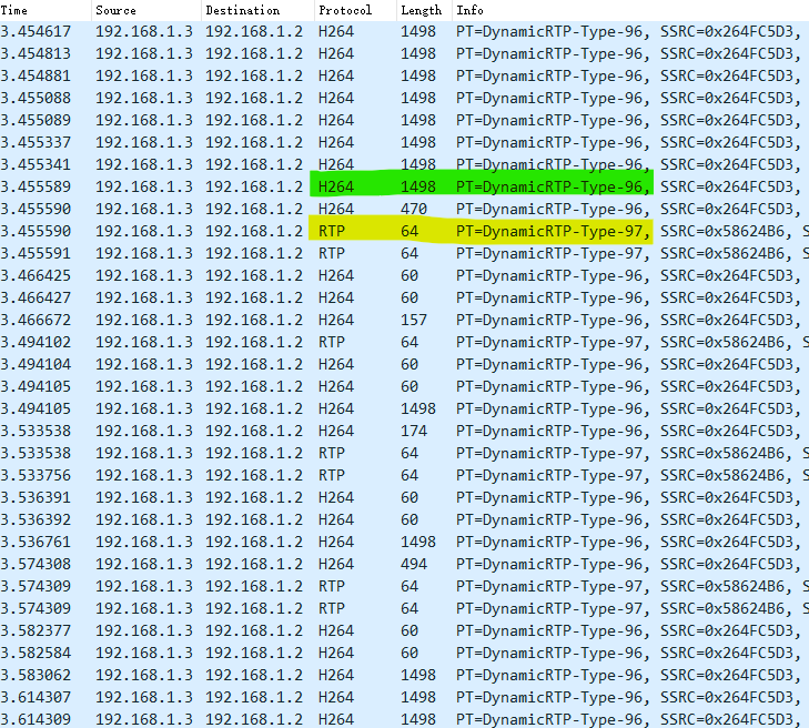 再往下看,会看到传输的数据,有两种负载类型96和97,从SDP描述信息已经知道96为视频流,所以可以把RTP包进一步解包,然后用H264解码;97为音频流,由于没有找到音频的解码协议,因此没有对RTP包进一步解码。