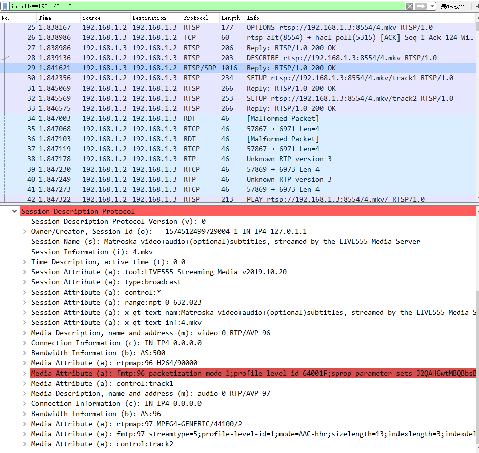 可以看到,开始建立链接的过程中,类似tcp三次握手的方式,相互确认。其中有一个步骤是服务器向客户端发送sdp描述文件RTSP/SDP协议。查看具体信息会发现有Media Description, name and address (m): video 0 RTP/AVP 96 和 Media Description, name and address (m): audio 0 RTP/AVP 97 分别表示视频流为负载96,音频流为负载97。这和RTP的SDP文件是一样的。也就说明了,RTSP协议会自动发送SDP文件,不用再去手动写一份SDP文件然后用VLC打开。