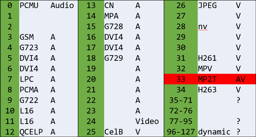 可以看到有一些类型是固定的。正如上图显示的负载类型为33,就表示这个RTP包的内容为封装为TS的音视频数据,客户端就可以按照mpeg ts解码了。如果使用的是96以上的负载类型,就需要写一个sdp文件告诉客户端怎么解码了。