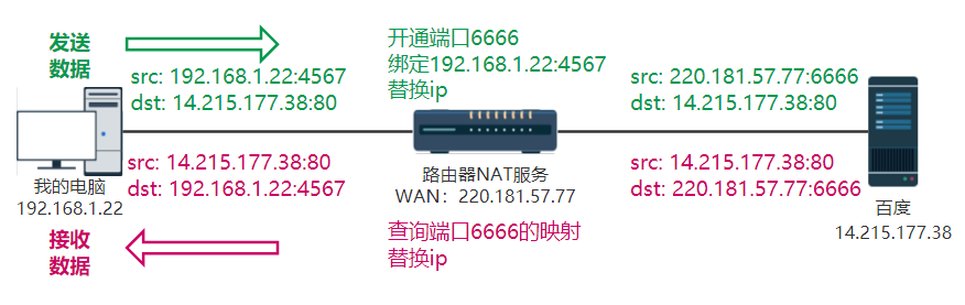 当有电脑访问互联网时,比如访问百度,电脑会在IP数据包中填写源地址为自己的IP:Port,目的地址为百度IP:80,然后发出去,首先经过路由器,路由器的NAT服务会开通一个端口并绑定该电脑,然后将IP数据包中源地址换成路由器的公有地址和新开的端口发送出去,等到百度回复的IP数据包到来后,路由器的NAT服务再根据端口号选择将数据包发给哪个电脑,具体如图: