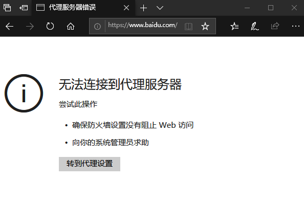 设置好后,用浏览器打开百度,发现无法连接到代理服务器,说明Windows代理设置生效