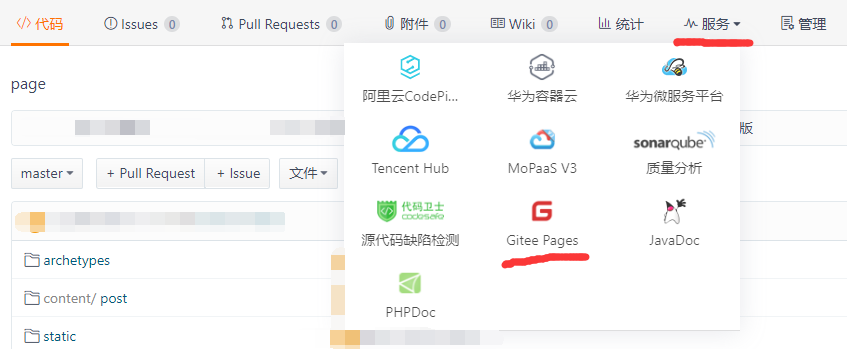 我用的方式为码云的page服务,将hugo工程托管到码云后,page服务会替你生成网页并给你一个网页空间。具体实现步骤是先在码云上建立一个工程,将hugo上传到工程,然后再服务里找到page按照要求填写一下就可以了,如图